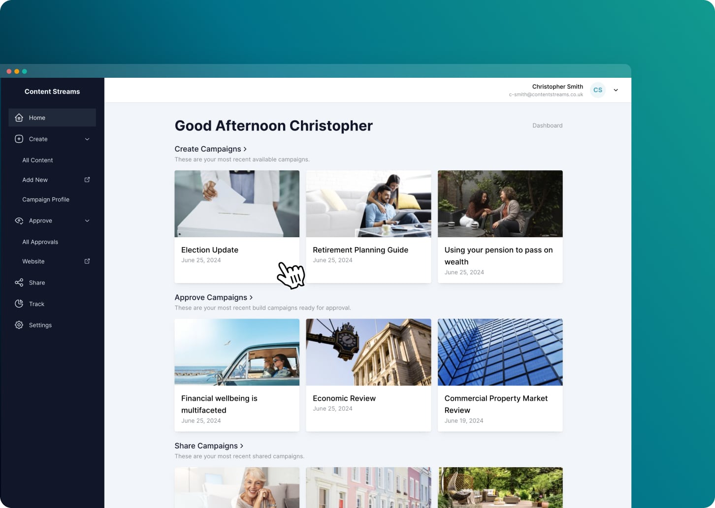 Content Streams enables advisers to create, approve, share and track content across all their marketing channels - from within the platform.